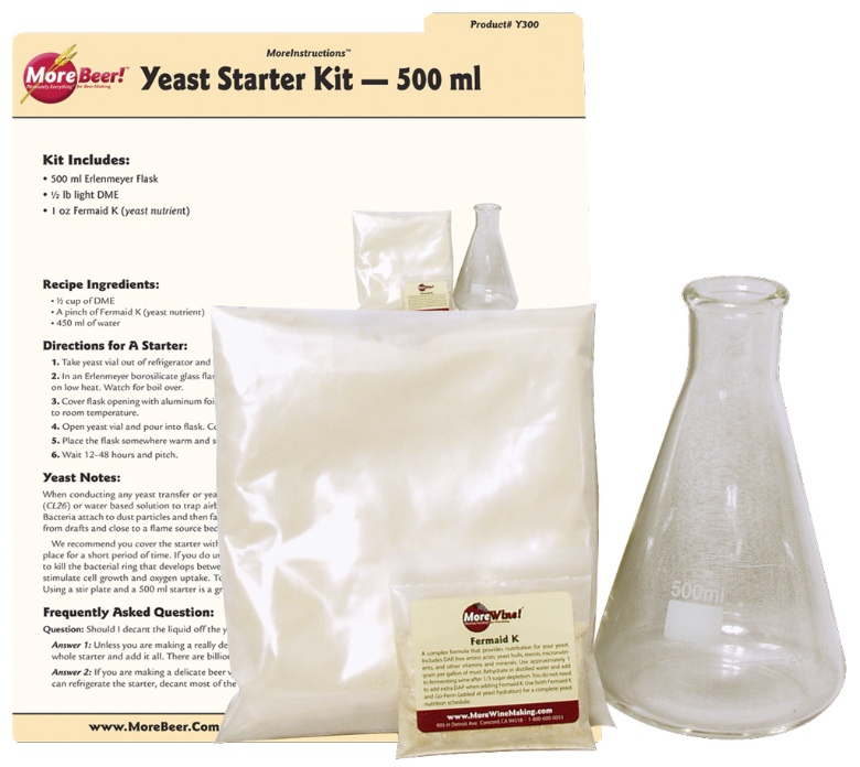 500ml Erlenmeyer flask, 1/2lb light dried malt extract & 1oz Fermaid K (Yeast Nutrient). This starter kit is for growing liquid yeast starters. The idea is that the starter acts as a mini batch of beer where the yeast cells replicate before being pitched into your 5 gallon batch. More yeast means fermentation starts faster. The bacteria and wild yeast that got into your beer during the transfer from kettle to fermenter have less chance of creating a negative flavor impact upon your beer.,,(We do not recommend the use of an electric element with these flasks. If this cannot be avoided, we recommend using a larger pot as a hot water bath on the stove.),,In the lab world, these flasks are known as "Student Grade". A great flask for making yeast starters!(Student grade is not the highest grade flasks and will have minor defects)